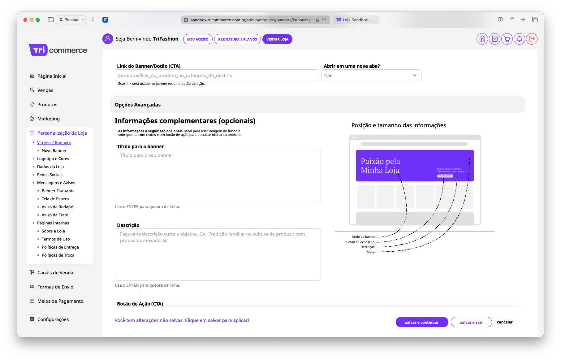 O módulo Banners, disponível na seção Personalização da Loja, permite adicionar e personalizar os banners principais e secundários da sua loja virtual. Banners bem configurados são uma ótima forma de destacar promoções e atrair a atenção dos seus visitantes, além de dar mais charme e movimento à sua loja.