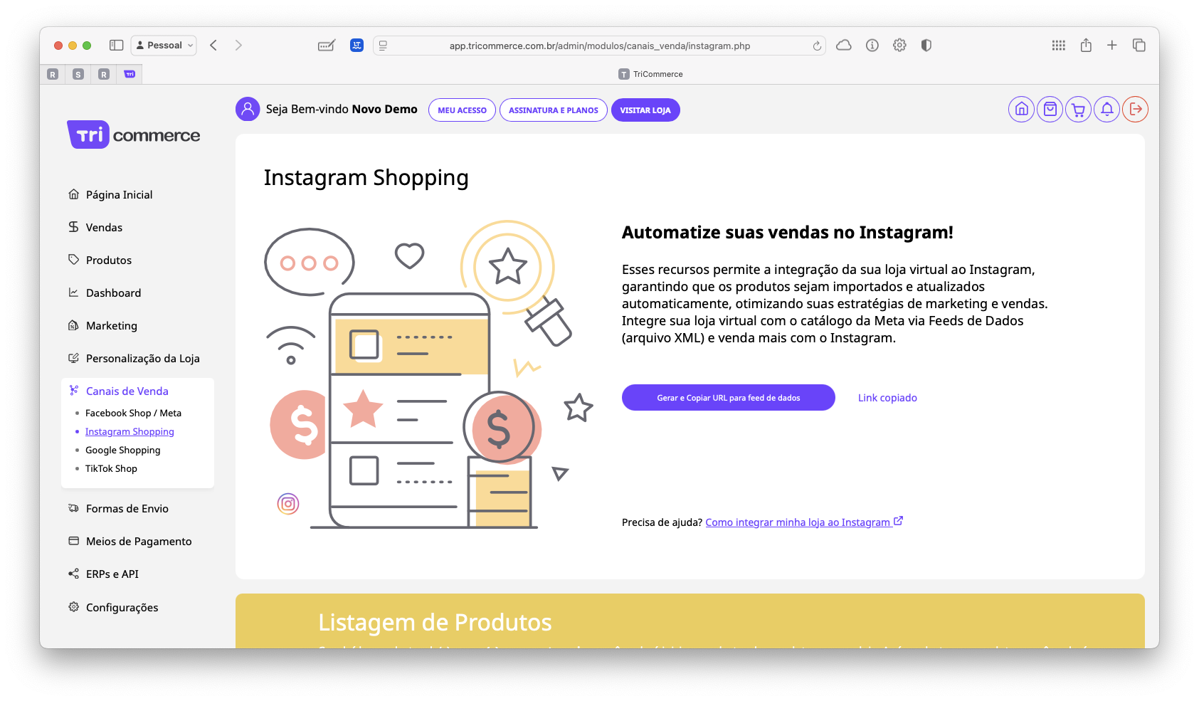 Integrar sua loja com Facebook, Instagram, TikTok e Google Shopping através de feed de dados (arquivo XML) permite exibir seus produtos nas buscas orgânicas e pagas dessas plataformas. Esse método de integração garante a listagem automática dos seus produtos nas plataformas, aumentando a visibilidade e facilitando a gestão do seu catálogo online.