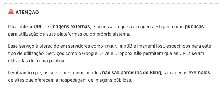O BLING, quando integrado, só permite cadastrar imagens via URL para exibição externa. Desta forma, o lojista deve acessar sua conta BLING, ir em preferências> Configurações de produtos> e selecionar a forma de cadastro das imagens para "URL de Imagens Externas".