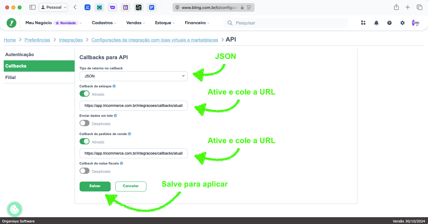 Para utilizar os Callbacks, será necessário cadastrar duas URLs nas configurações de API do Bling: uma para Estoque e outra para Status de Pedidos.