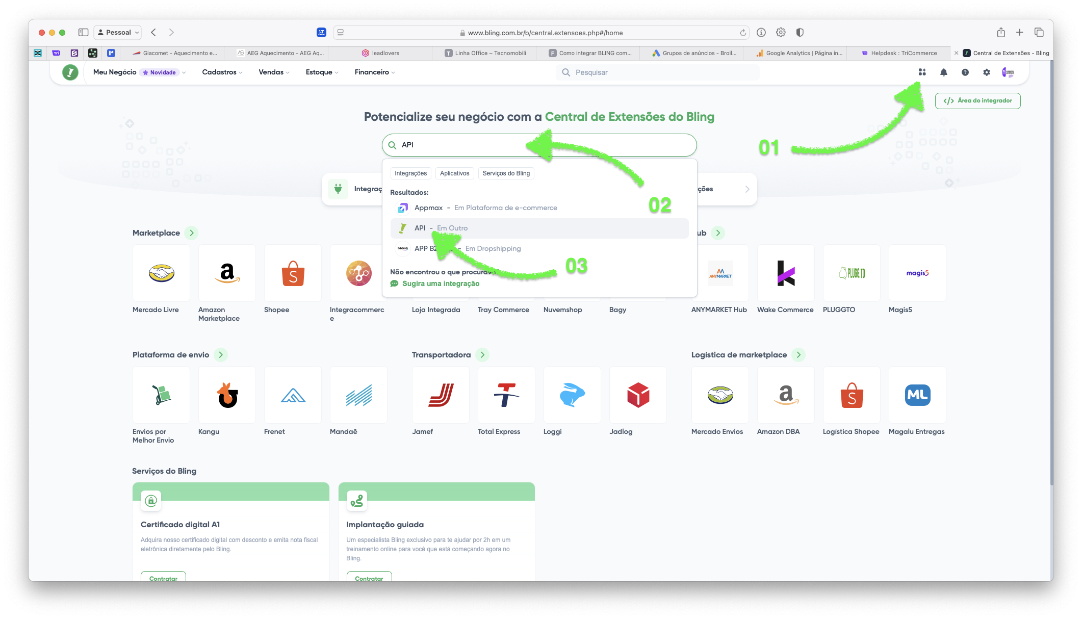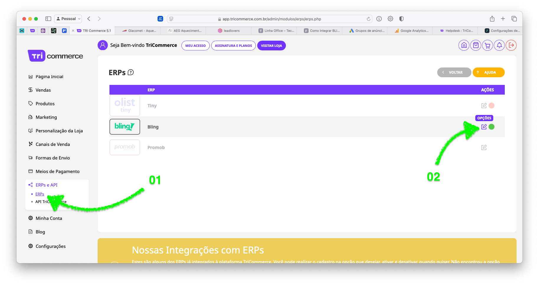 Para integrar o BLING com o TriCommerce, siga estes passos: