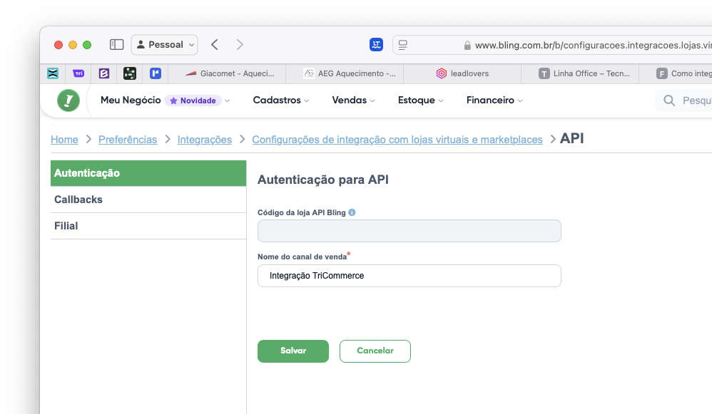 Ainda no Bling, será necessário cadastrar essas duas URLs e informações para a integração e atribuir as permissões de acesso adequadas.