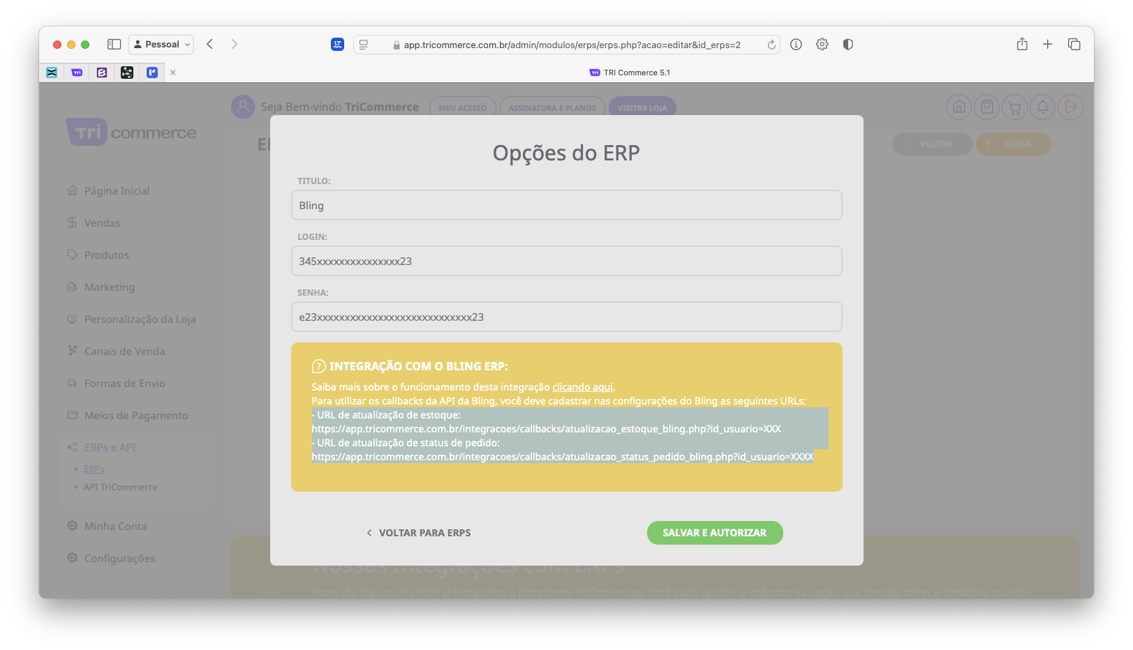2º - Acesse o painel da sua loja virtual no TriCommerce e insira o login e senha do aplicativo nos campos correspondentes em Minha Loja > APIs de Integração > ERPs > BLING.