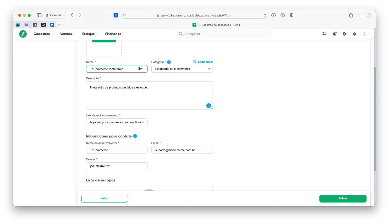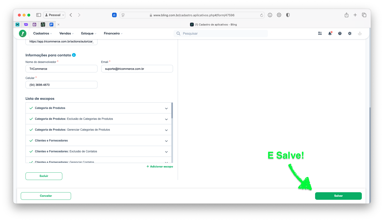 URL de redirecionamento: https://app.tricommerce.com.br/actions/autorizar_bling.php